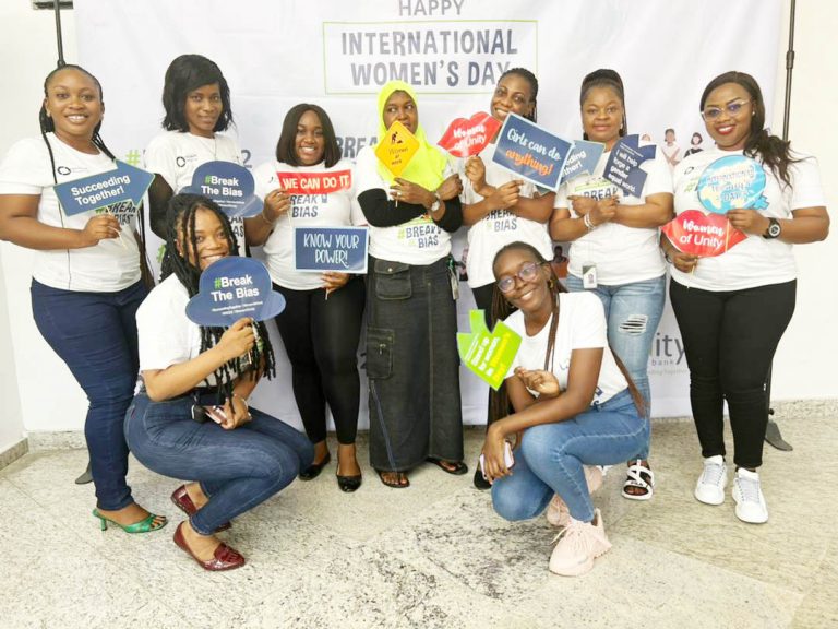 Some female staff pose for a photo at Unity Bank HQ in Lagos in commemoration of the International Women’s Day 2022 celebration. LAGOS. 03-07-22.In commemoration of...
