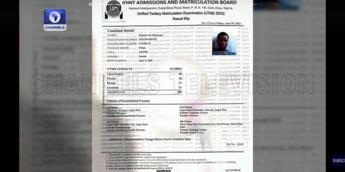 The board released a result slip which it confirmed as authentic showing that her result for 2023 UTME was 249.