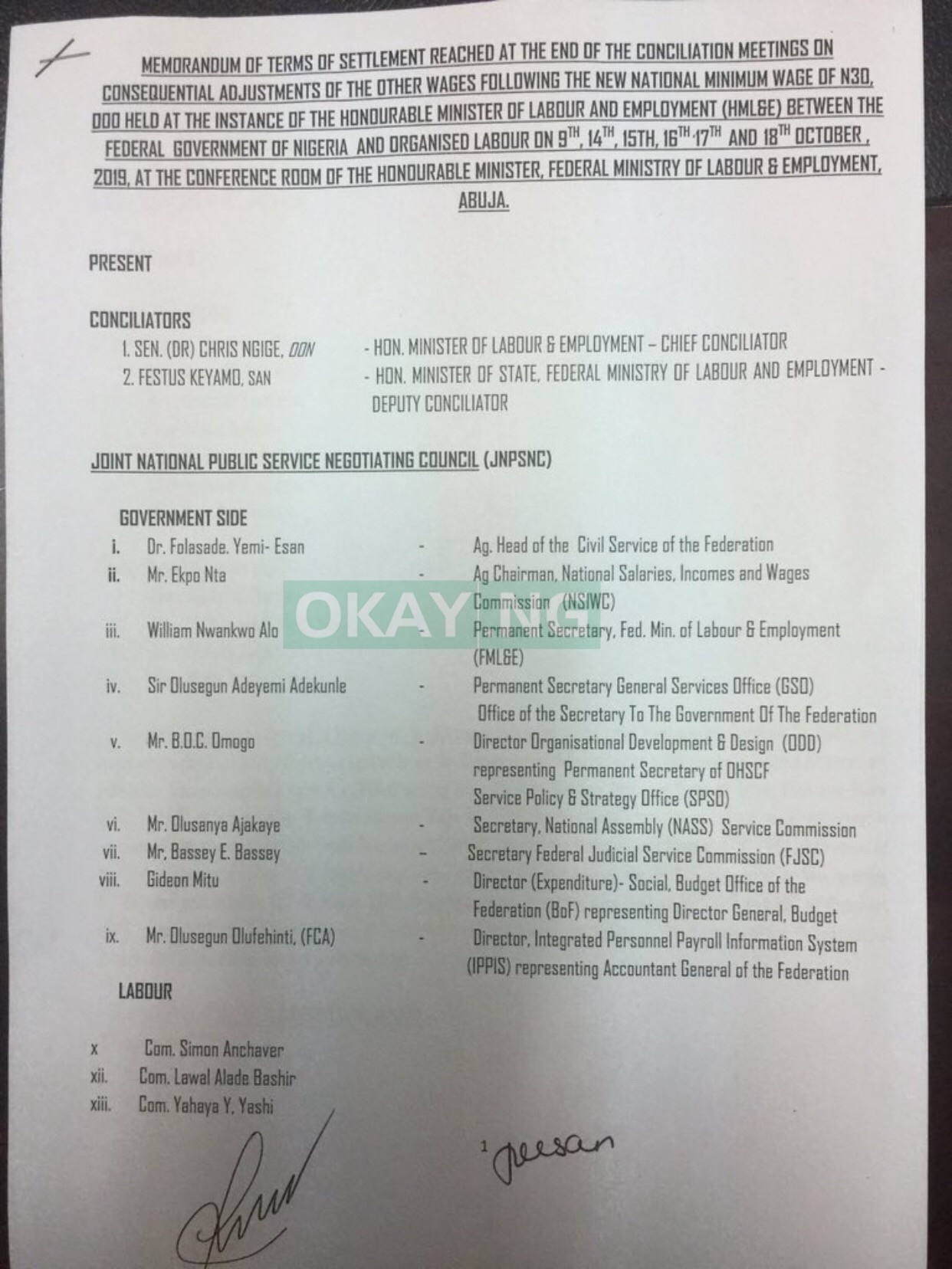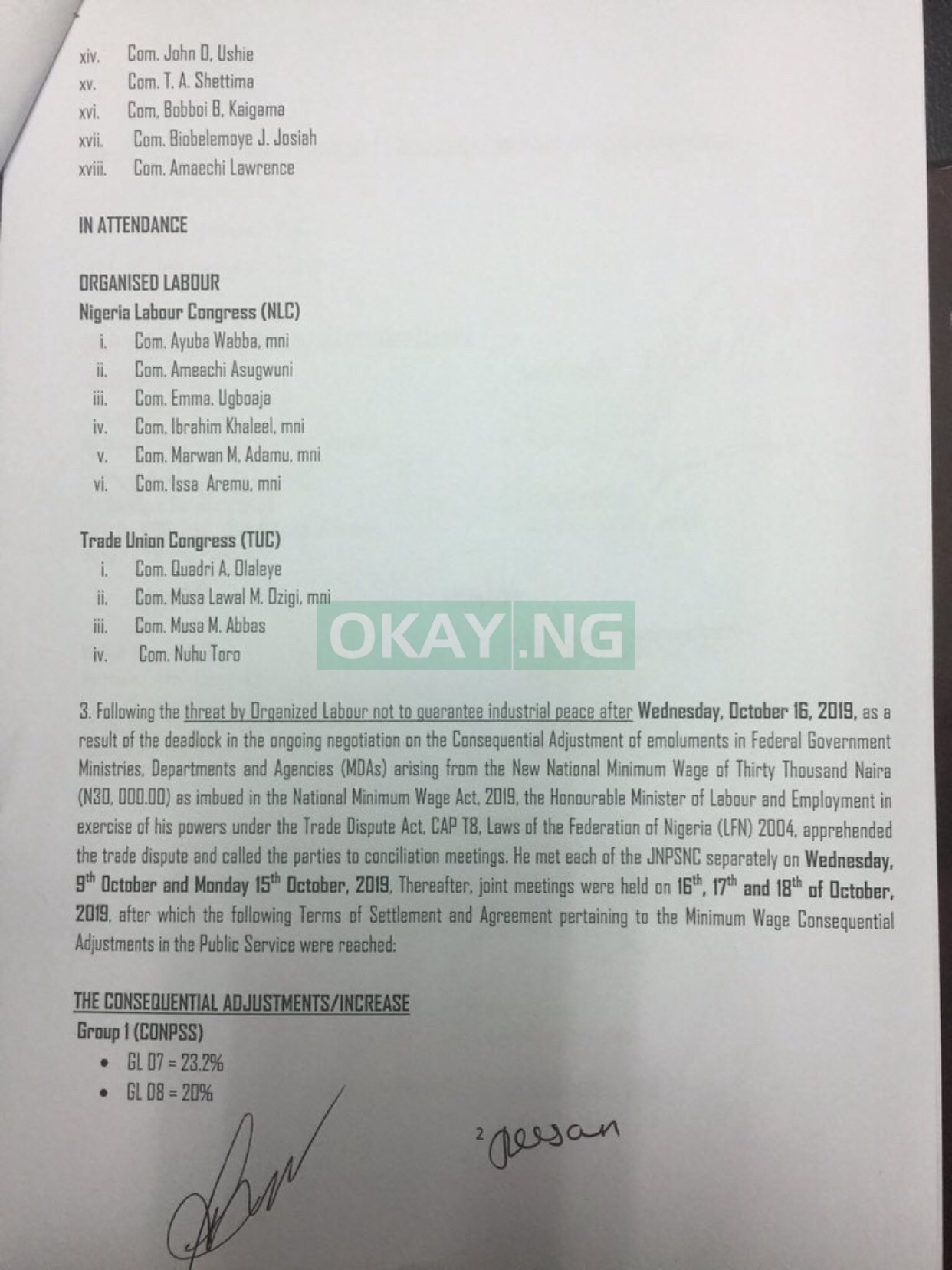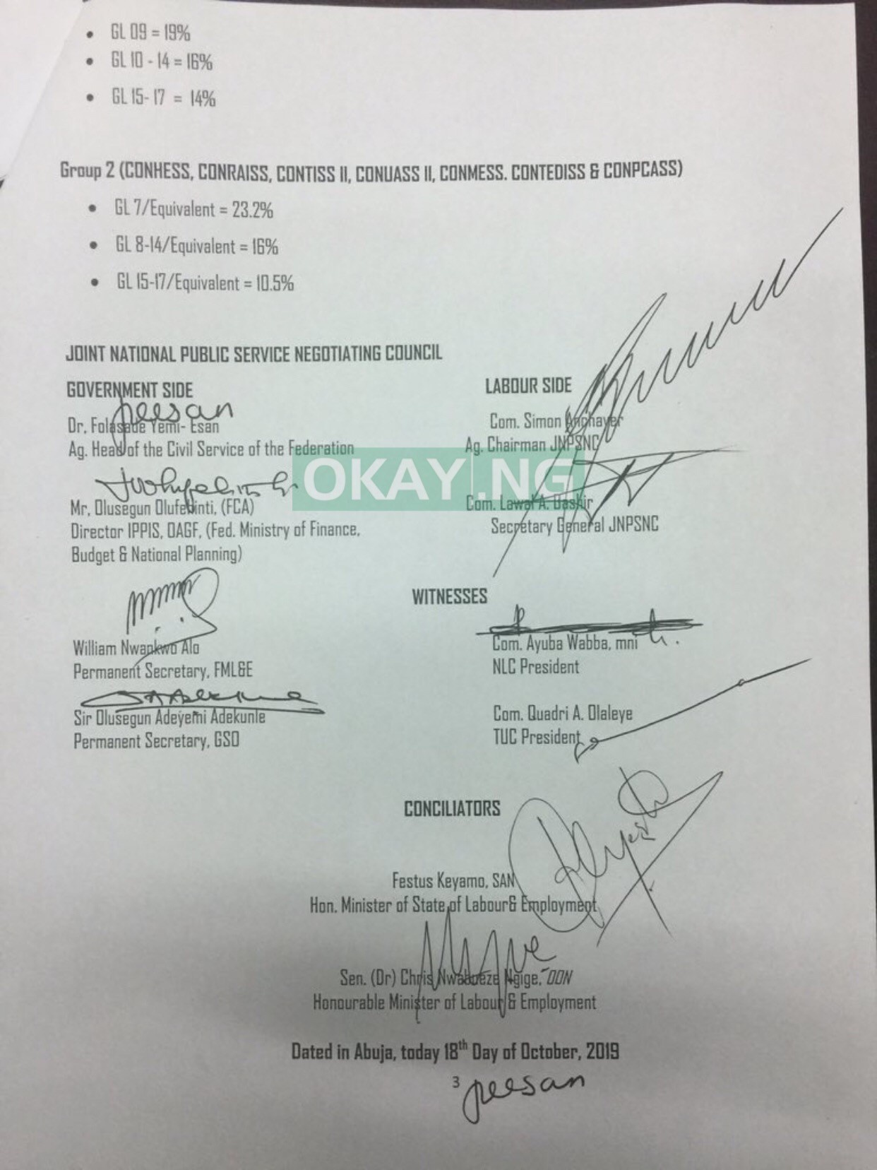 Ending the meeting on Friday morning, October 18, 2019, the FG and labour agreed to a percent increase of 23.2 percent for workers on level seven and 20 percent for workers on level eight, while it agreed on a 19 percent increase for workers on level nine.